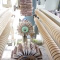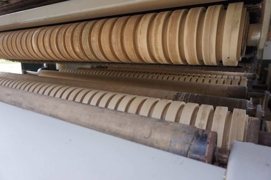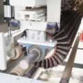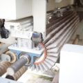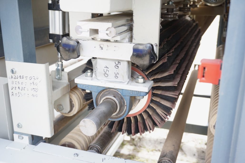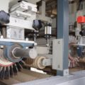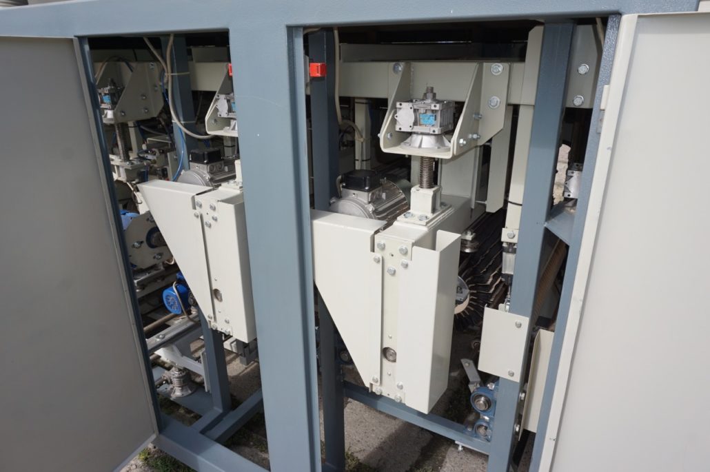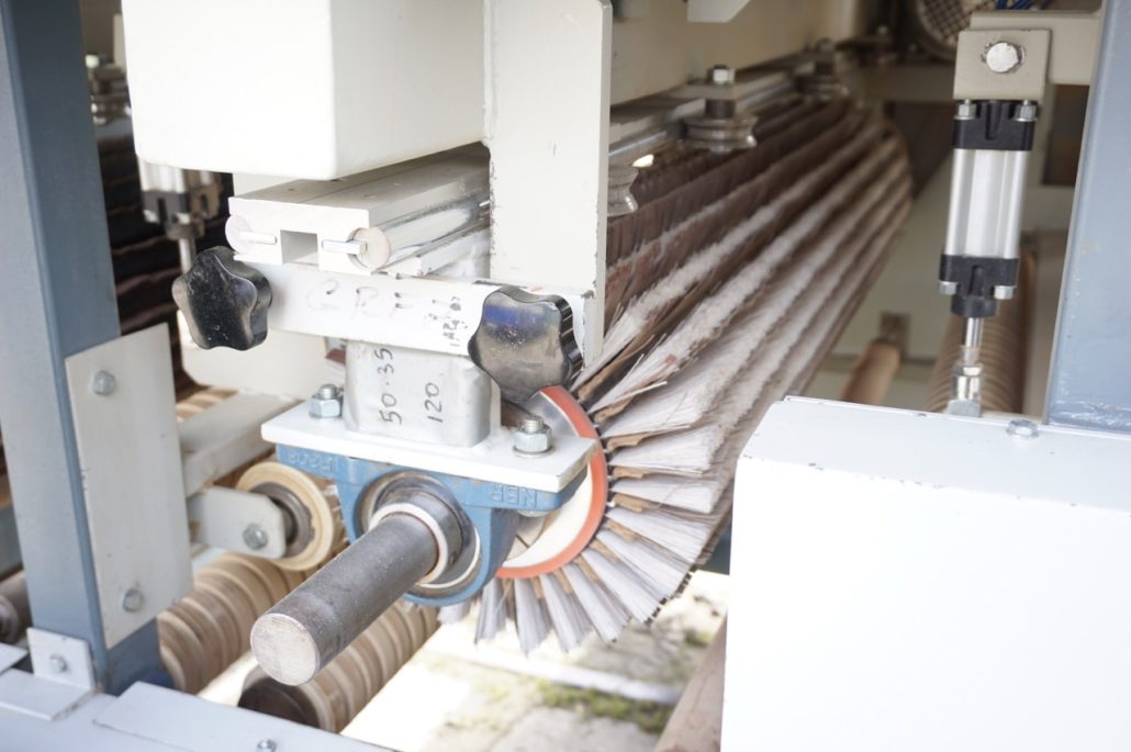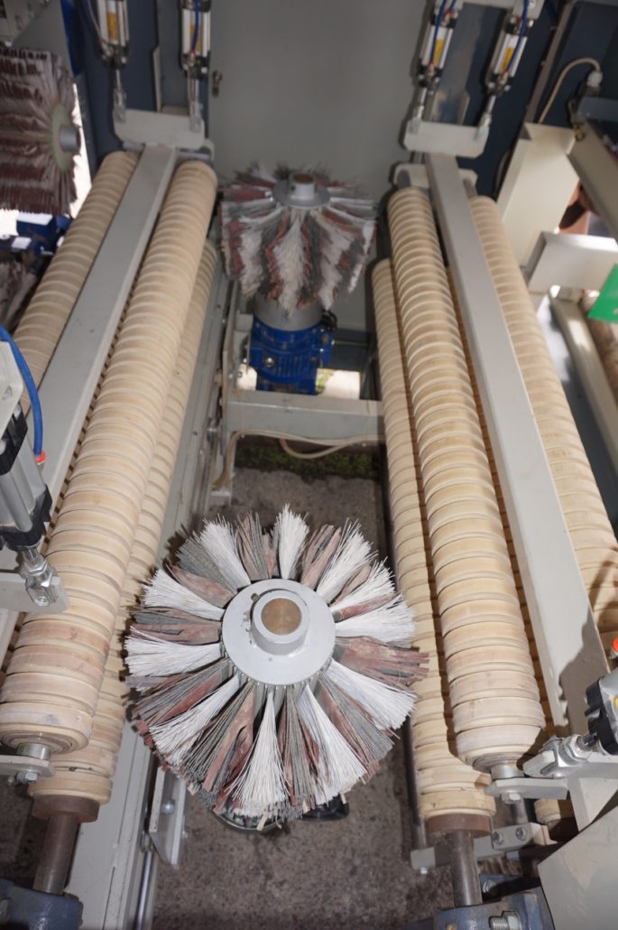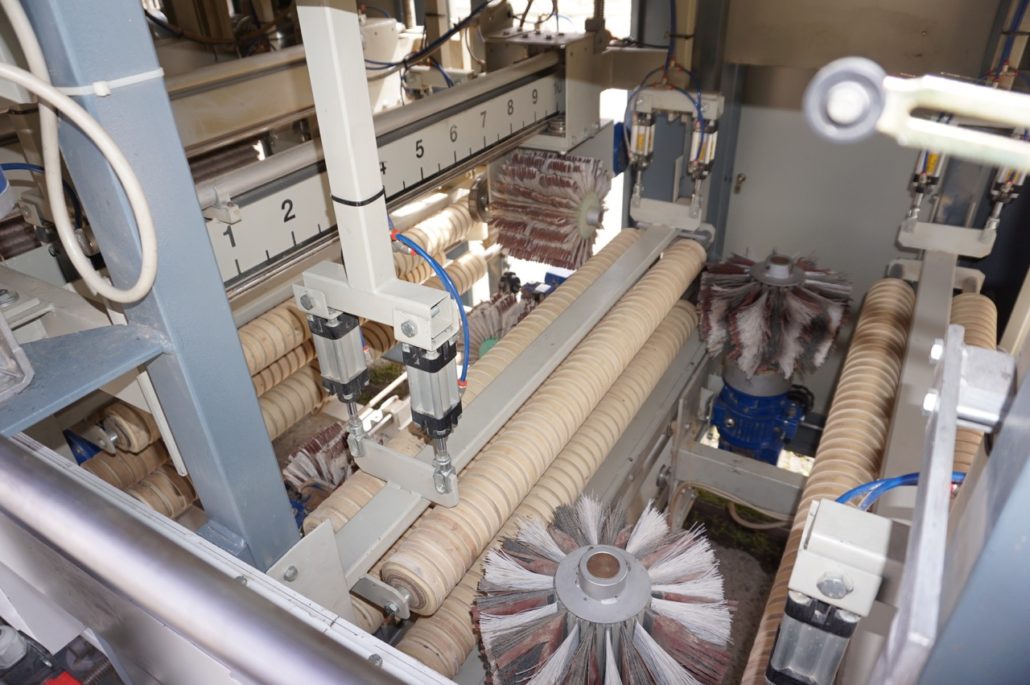 Breitenverstellbare Vertikalbürstaggregate mit Einlaufvorrichtung zum Schleifen von Kanten. |