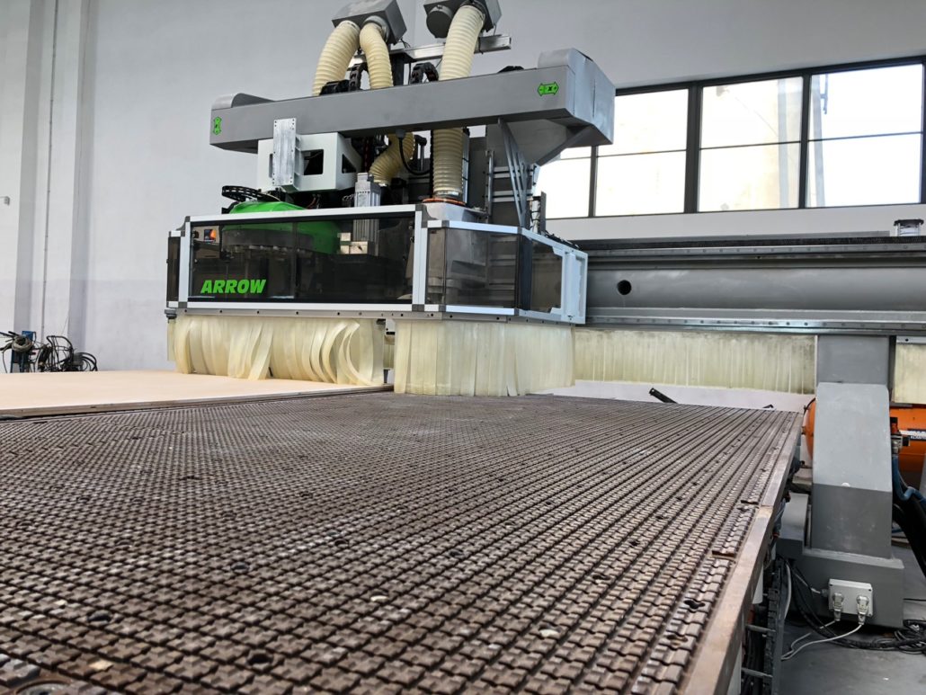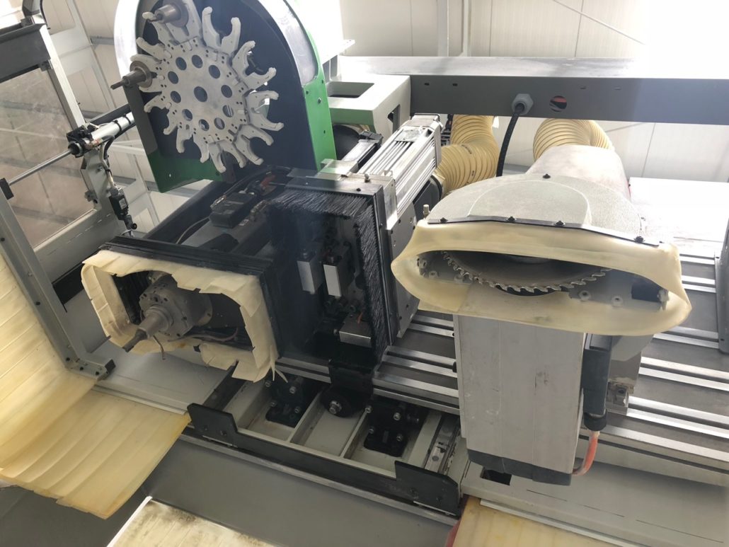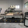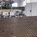 Die beiden 30 mm – Raster – Arbeitstische, zum schnellen Einsetzen von Dichtungsschnur oder Standart-Vakuummoduln, aus Phenolschichtmaterial sind mit einem Vakuum-Spannsystem ausgestattet. Auf der gesamten Fläche sind Vakuumdurchlässe im 150mm-Raster mit Schnellverschlüssen integriert. 18 absenkbare Anschläge (9 je Tisch) in „L-Form angeordnet, um 2 Referenzpunkte je Tisch im Achsabstand von 780 mm zu kreieren. M8-Gewindeeinsätzen zur Befestigung von Spannschablonen oder Spannvorrichtungen. Tasten für Start, Stop, Not-Aus, Vakuum Ein/Aus und Manometer des Unterdruckes. 1 pneumatischer CNC-gesteuerter Ausgang für jeden Arbeitstisch. |