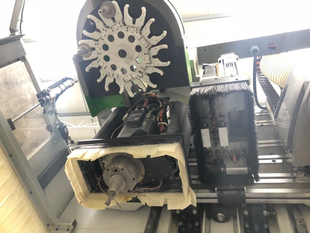 13 vertikalen Spindeln, 32mm Teilung, in T-Form angeordnet sind, 5 in X-Richtung und 8 in Y-Richtung, 3 Gruppen für gegenüberliegende horizontale Bohrungen, davon 1 in X-Richtung und 2 in Y-Richtung mit insgesamt 6 horizontalen Spindeln. |