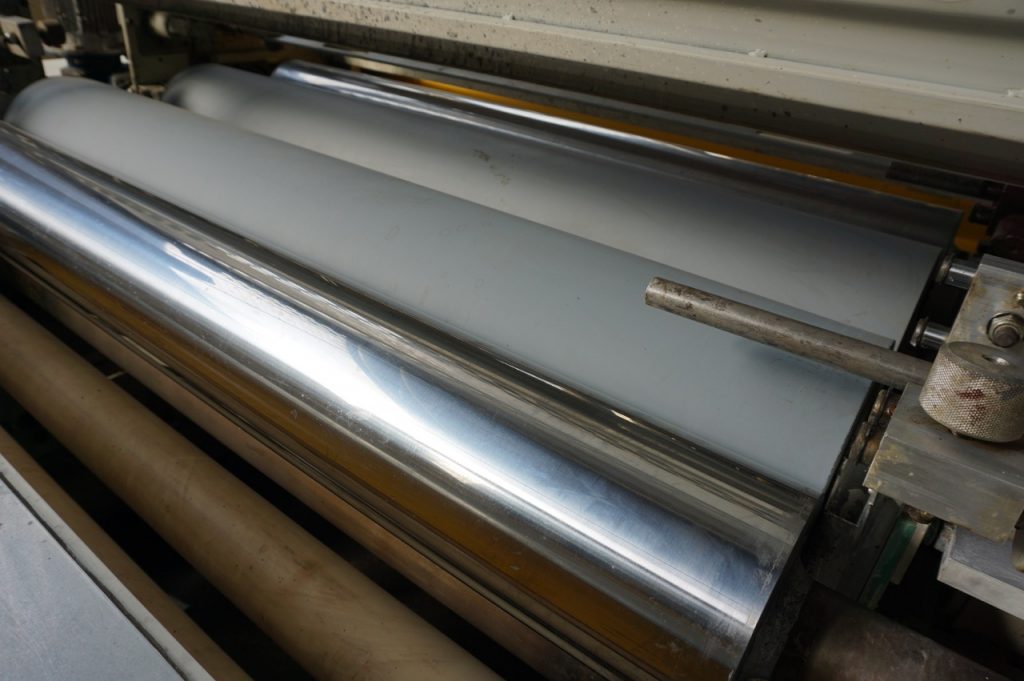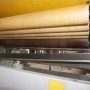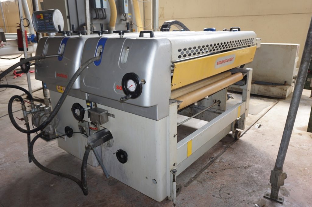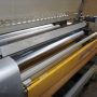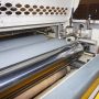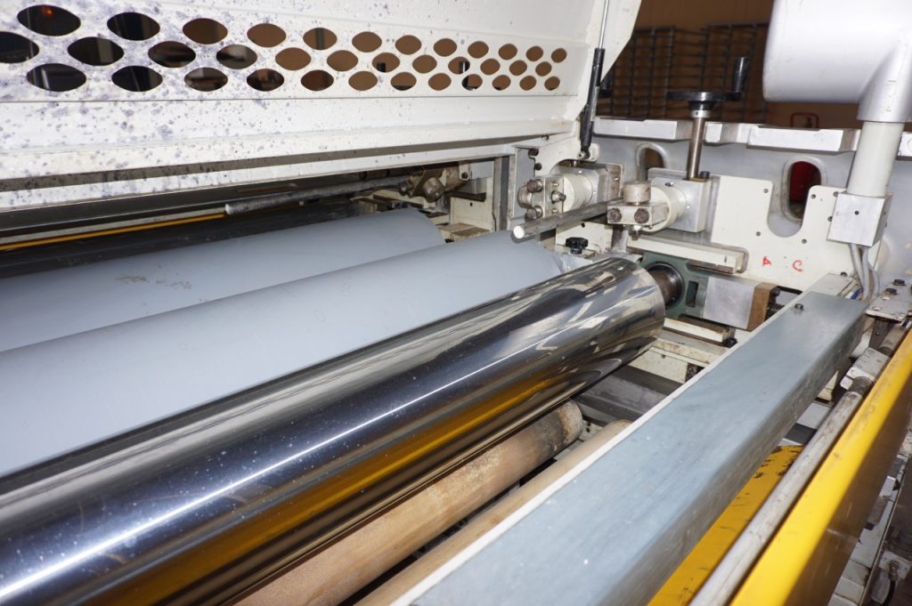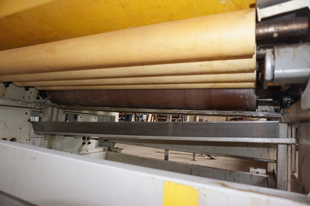 Walzenauftragsmaschine mit 2 Köpfen; die zweite Auftragswalze ist eine REVERSE Walze zum Auftrag von erhöhten Grundiermengen mit hoher Viskosität.