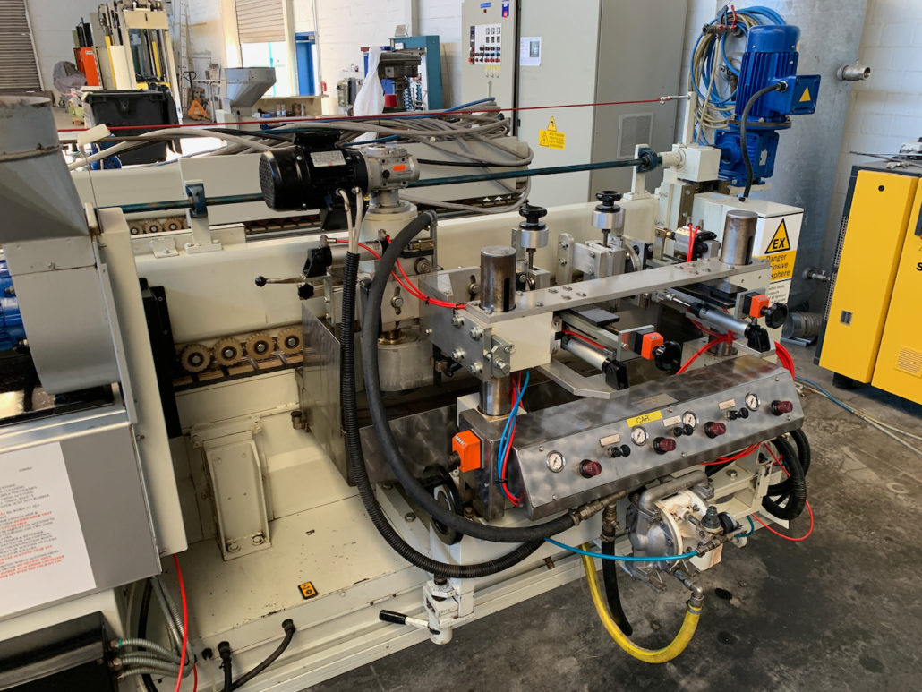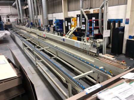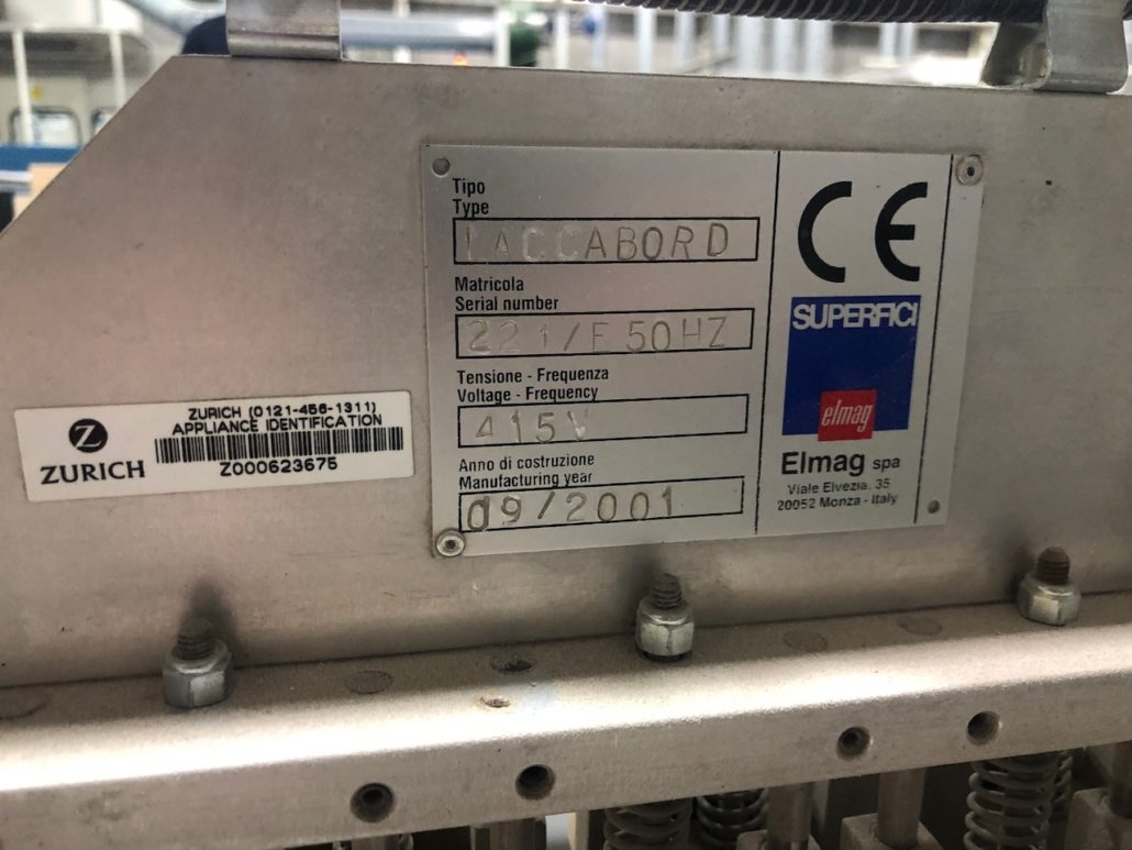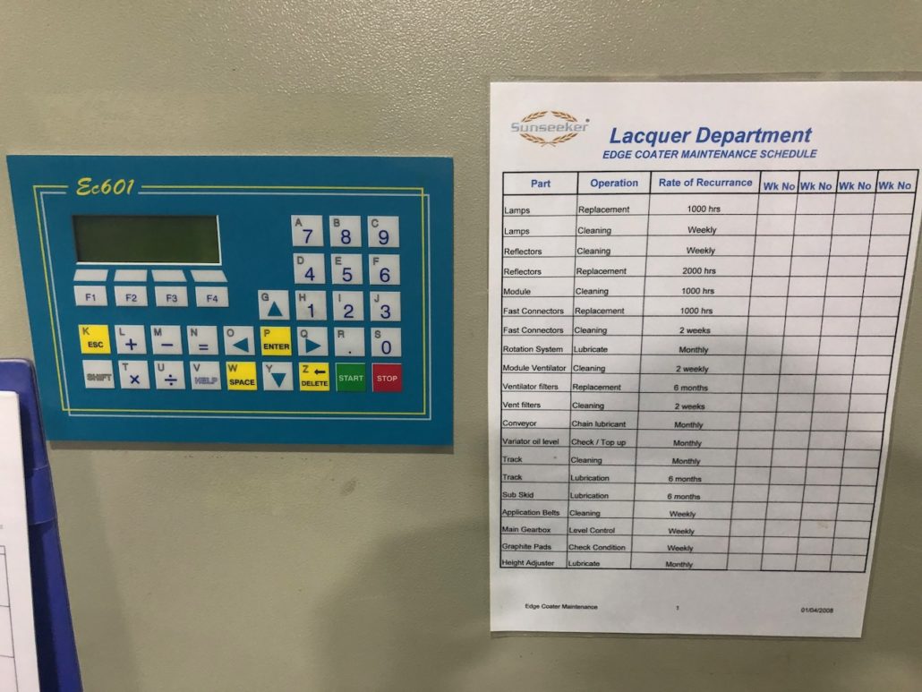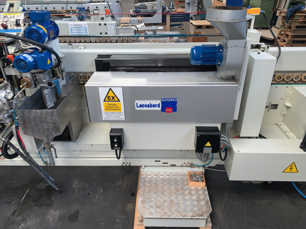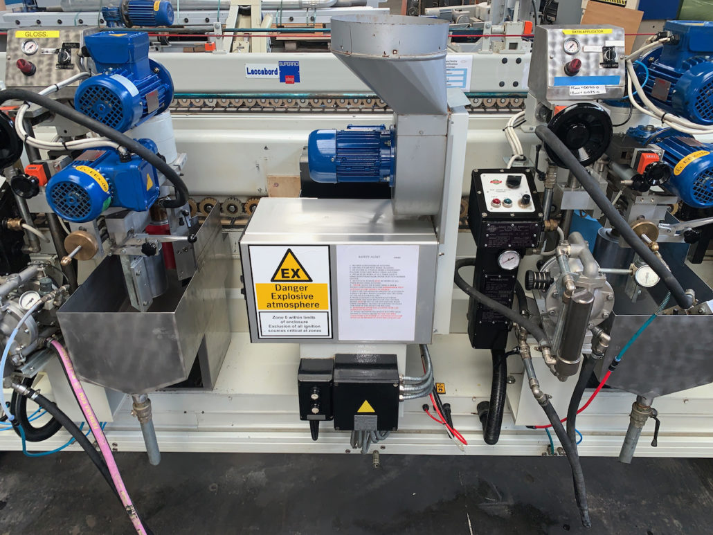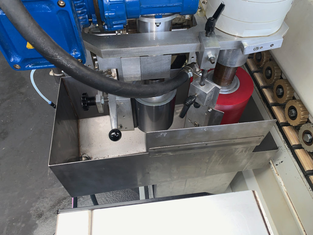 – Belt paint applying unit mod. NST with 2 coating knifes in nylon. Lacquer applied 5 – 70 g/m2, Motor 0,37 kW. Membrane pump. Belt oscillation.